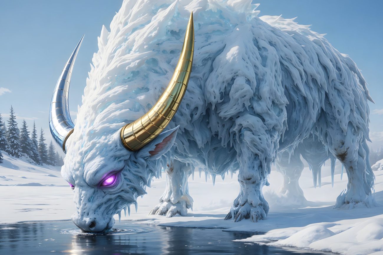 By the will of Ahti, King of the Islands, a wondrous creature was brought fully into the world. It was no spirit or illusion, but a living bull of immense size and strength. Its horns shone like gold and silver, and its body pressed heavily upon the earth as though the land itself struggled to bear it.