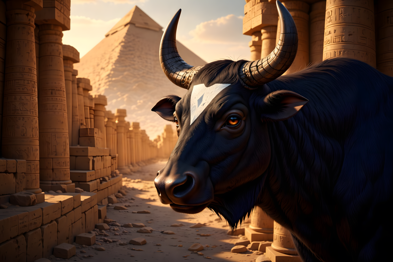 Apis was born when a ray of divine light struck a cow, filling her womb with the power of the heavens. From this miracle came a calf unlike any other, marked from birth as holy. His black body bore signs placed by the gods themselves, and through these signs the people knew that a divine will now walked among them.
