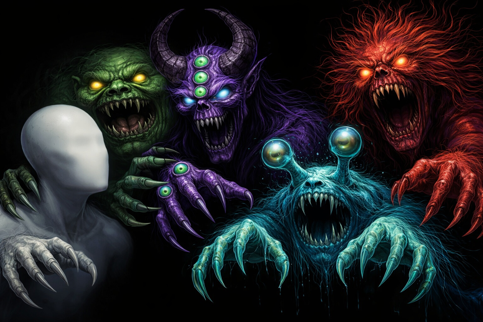 The faces leer and stare in different directions, while the hands reach outward as if the darkness itself were alive. There is no clear center to the creature, no fixed form that can be grasped or confronted.