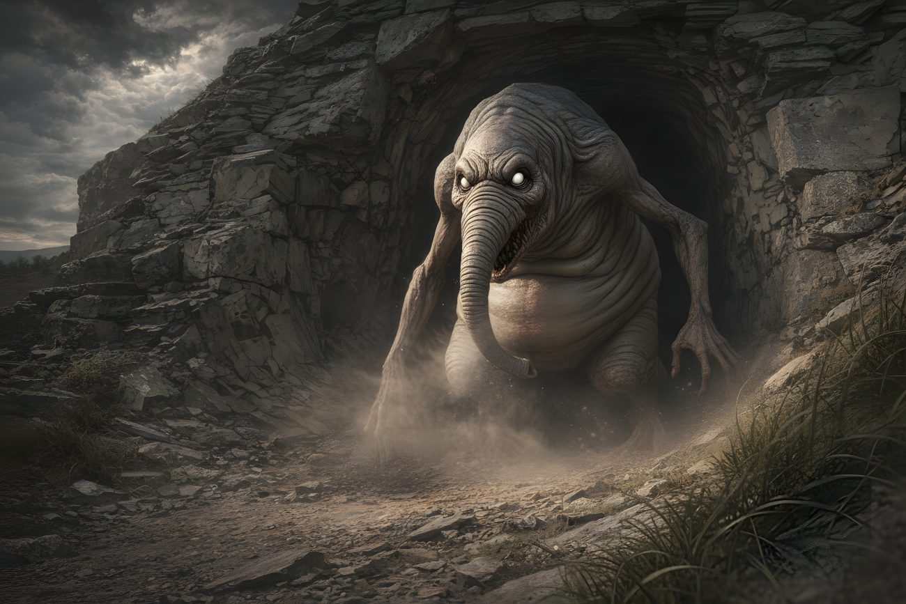 The Buggane was a shapeshifter. At times it appeared as a monstrous black calf, at others as a towering man with horse’s ears or hooves. In its truest and most dreadful shape it was covered in coarse black hair, with blazing eyes like torches and sharp tusks gleaming in its mouth. Some said it bore bull’s horns. It was so immense that it could tear the roof from a church as easily as a man might lift a hat.