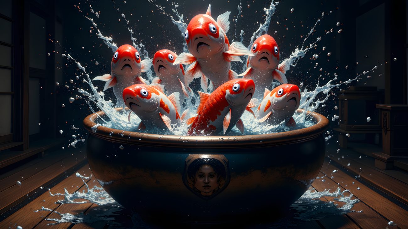 The fish, once harmless and beautiful, became vessels for her spirit. Their eyes gleamed with an unnatural light, and their movements grew violent and erratic. From within their small bodies, Monohana’s fury watched and waited.