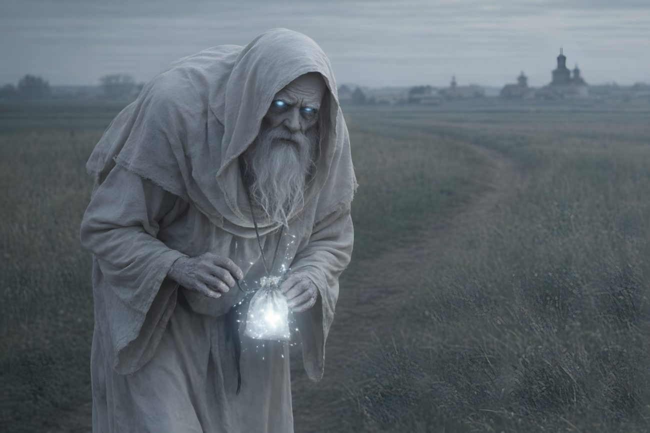 Belun is a field spirit in Belarusian mythology, most often described as a kind and benevolent being. He appears in the form of an old man with a long white beard, dressed in white and carrying a white staff. Though his appearance is humble and sometimes odd, Belun is associated with good fortune, guidance, and quiet help.