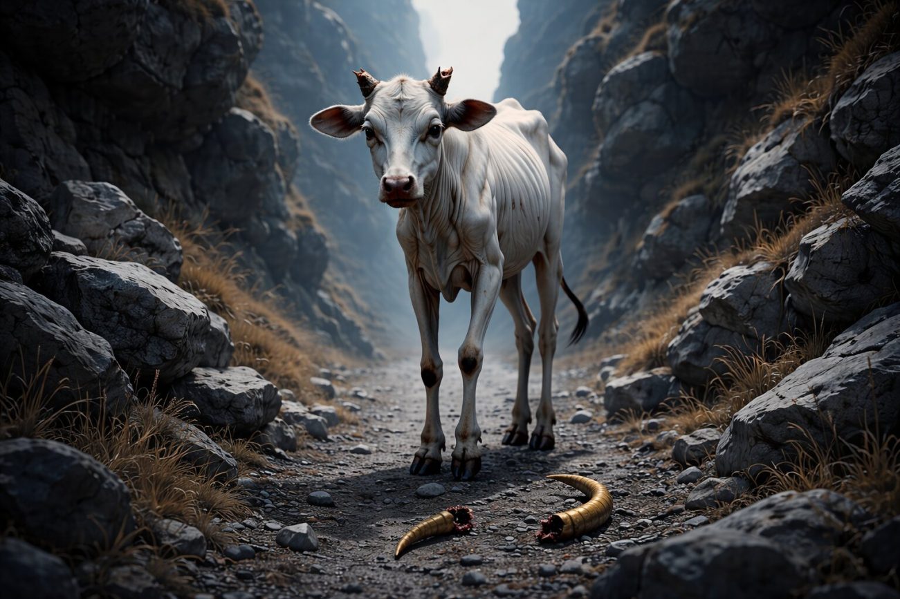 There was once a poor villager who owned a cow named Aykaska. One year she gave birth to a calf whose horns shone like pure gold. Though the family had little, they rejoiced greatly, held a small feast, and tied the calf in the place of honor within their home. They named it Golden Horn and cared for it with devotion.