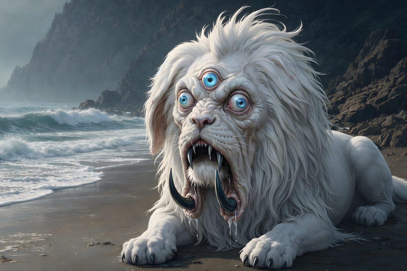 In illustrated yōkai scrolls from Japan, a creature known as the Nurikabe appears in a form unlike the better-known invisible wall of later folklore. This Nurikabe is a tangible beast with four legs and a powerful body. Its most striking feature is its enormous face, which bears three eyes that shine with an unnatural blue light. It has large, drooping ears like those of an elephant and two black tusks that curve outward. Its body is painted white, giving it a ghostly and imposing appearance. Some describe it as resembling a dog or a lion, though it does not fully match any known animal.