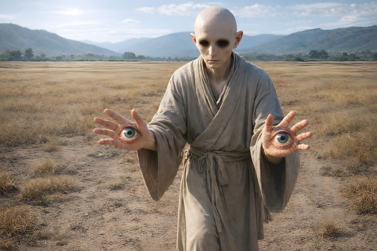 Me-te is also known by the name Te no Me, meaning “Eye of the Hand,” a name that reflects its strange and unsettling nature. In illustrations, it appears in a form similar to figures shown in Gazu Hyakki Yagyō, though it is depicted without wrinkles on the face, and its empty eye sockets are shown through deep shading.