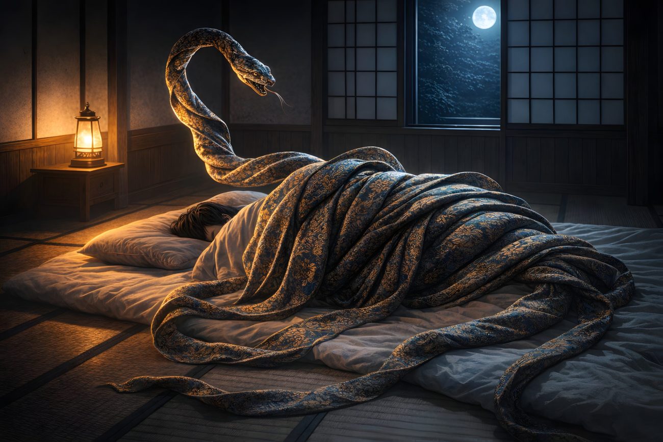 The Jatai is said to appear at night as a living obi, a kimono sash that moves on its own like a great snake. By day it is nothing more than a length of cloth, but after night falls it slithers from its resting place, coiling and gliding through rooms in search of victims.