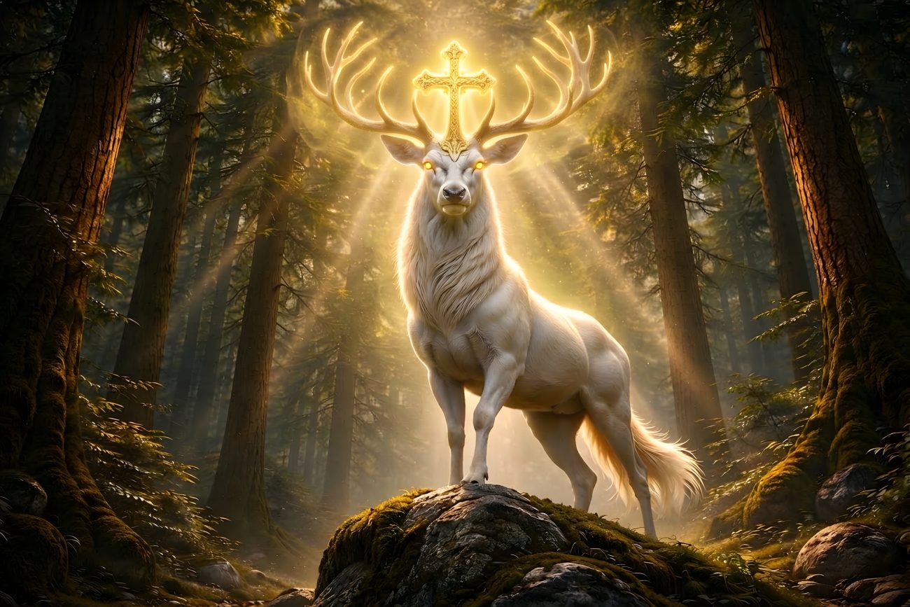 The deer bore a shining cross between its antlers, glowing as if lit by the sun itself. Faced with this vision, the hunters were struck with fear and awe. Recognizing the stag as something holy, they did not dare shoot it.
