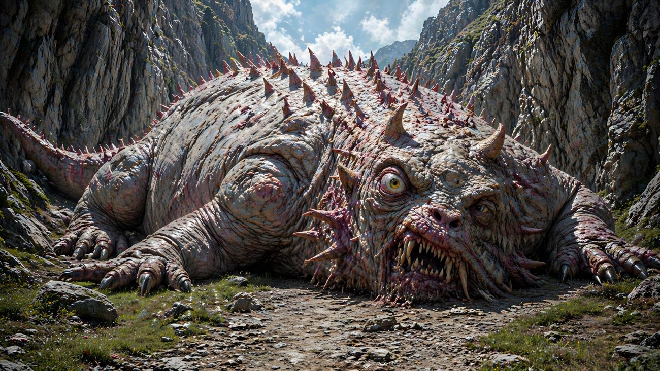 A dragon took up residence among the rocks, a grotesque and terrifying creature that threatened everything living in the area. It haunted the narrow route, making travel dangerous and filling the surrounding lands with fear. Neither man nor beast could pass safely while it remained.