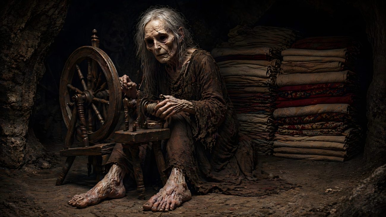 Habetrot is an ancient and mysterious figure tied to spinning, cloth-making, and the hidden world beneath the earth. She is described as an old, deformed woman who lives underground, surrounded by other spinsters like herself—women whose bodies have been twisted and marked by endless years of spinning thread.