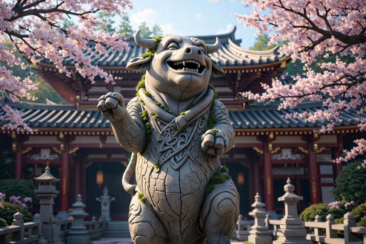 It is said that the joy of that day was so great that the stone cow statue before the shrine joined the dance. In its enthusiasm, the cow broke its neck and became known as the Sleeping Cow with a Broken Neck. The villagers preserved their celebration as the Takimiya Nembutsu Dance in memory of the rain and the event.