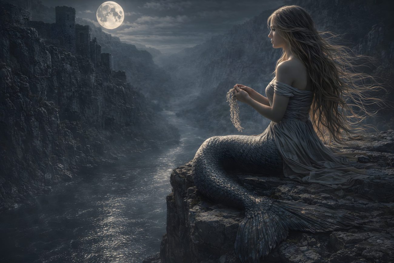 Since then Melusina is said to circle the rock and cry out whenever danger threatens the city. Every seven years she is believed to make a single stitch on a mysterious garment she is weaving from flax that grows upon the bare rock. When the garment is finished, she will be freed — but it is said that the city itself will then fall into ruin.