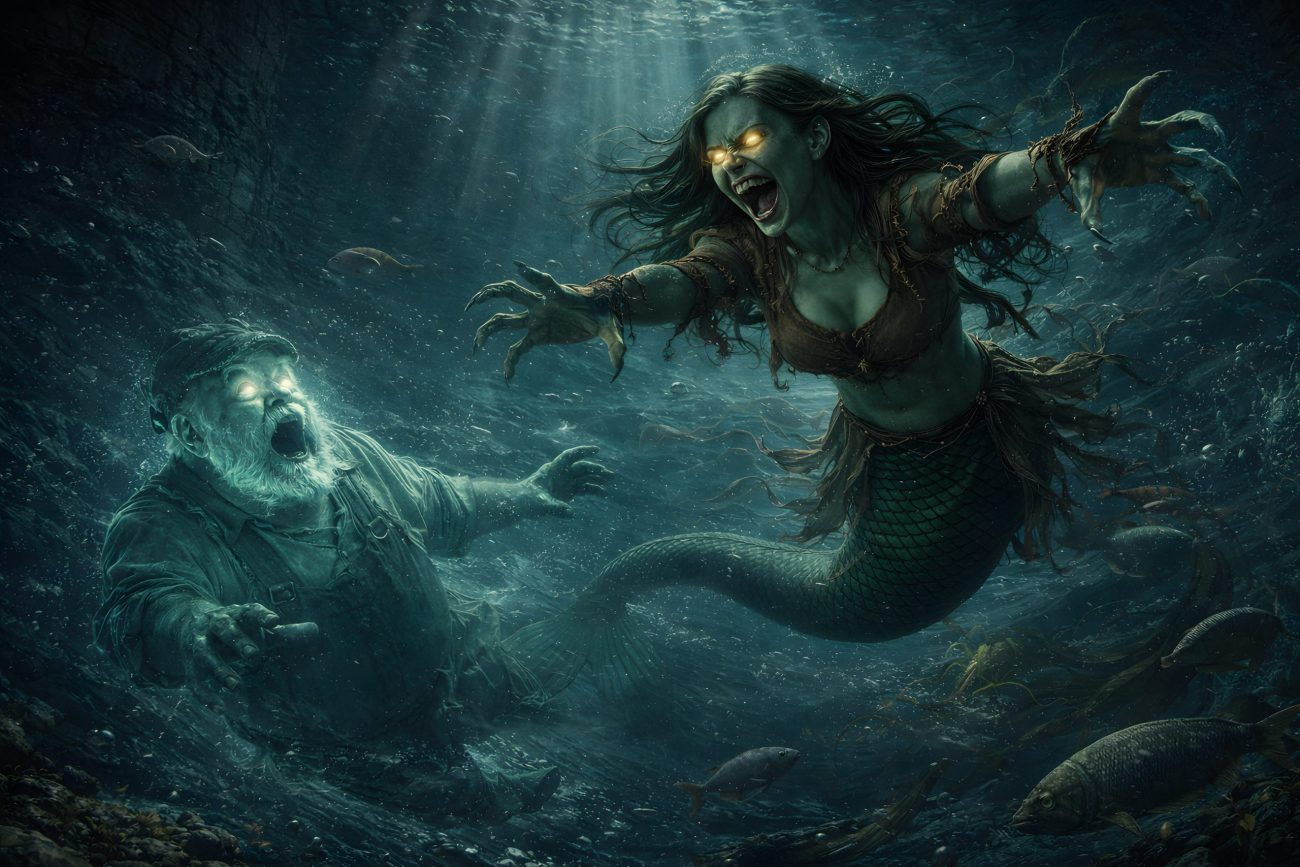 Angered by this, the water spirit rose up in fury and dragged the boatman down into the waves. He perished there in the current.
