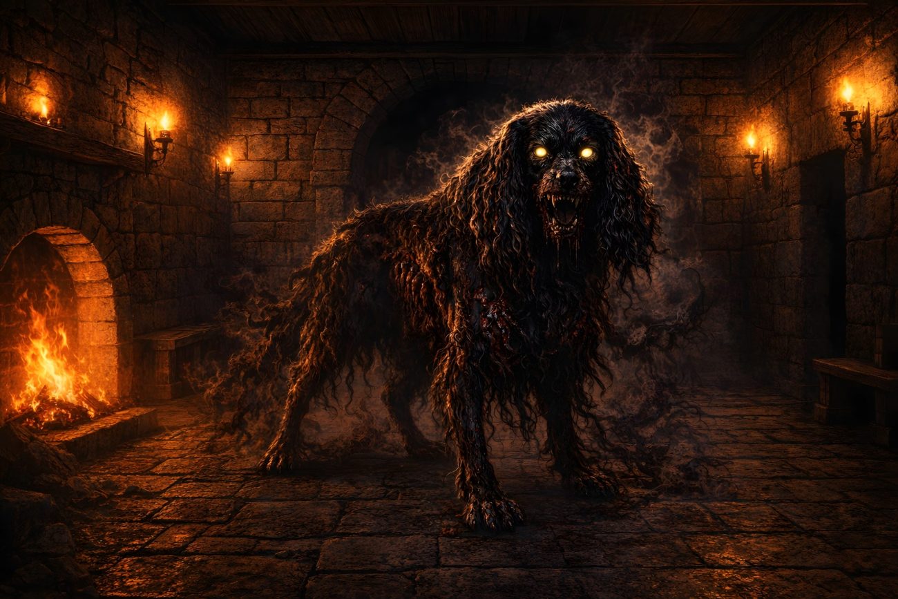 It appeared as a large shaggy hound, often described as resembling a black spaniel. The creature was seen moving through the rooms of the castle, but most often it lay in the guardroom beside the fire, visible to the soldiers stationed there. Over time, they grew accustomed to its presence, though it never ceased to disturb them.