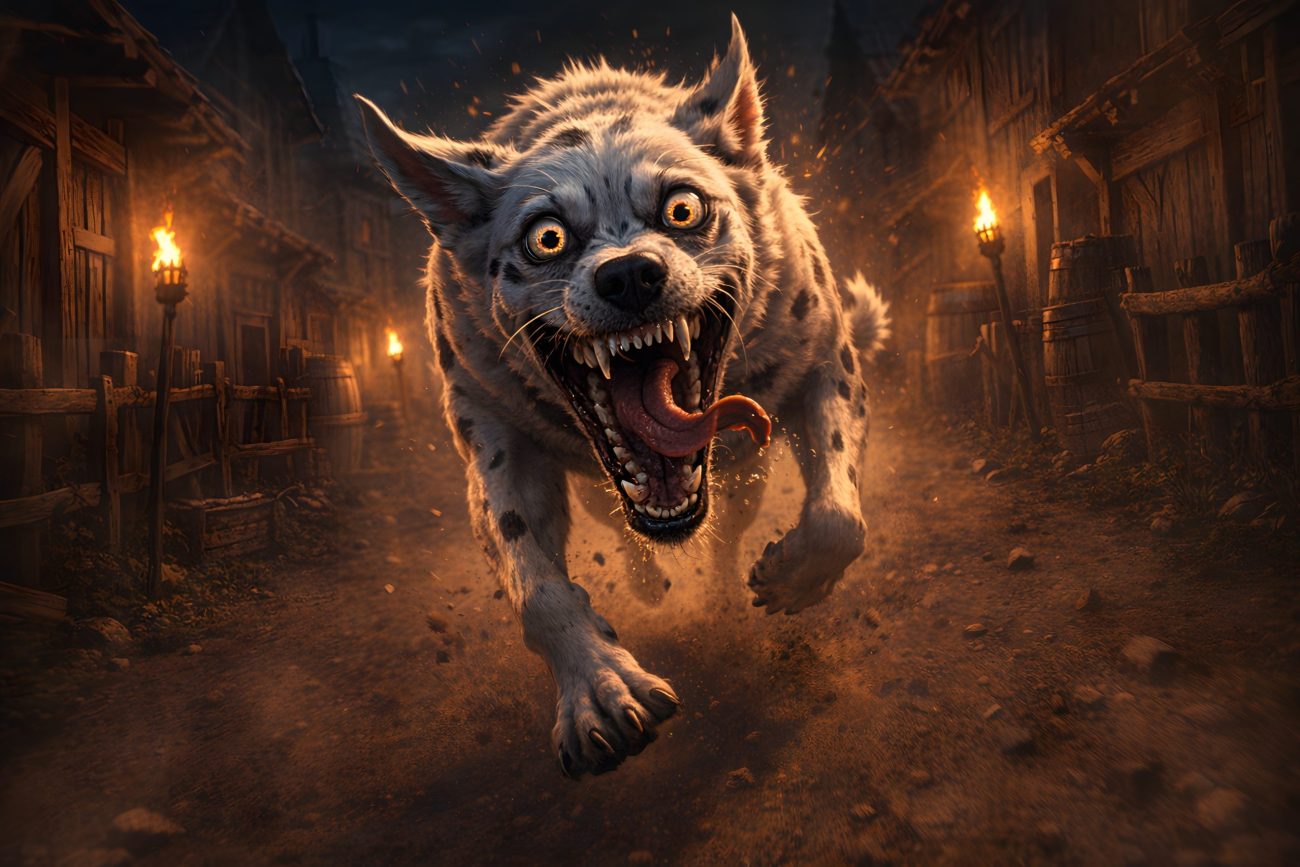 From then on, the creature lived a double existence. By day the dog stayed quietly in the stable, keeping out of sight. But each night, when midnight came, it slipped out into the street. There it ran through the village and fought fiercely with the other dogs, as if driven by some restless and savage urge.