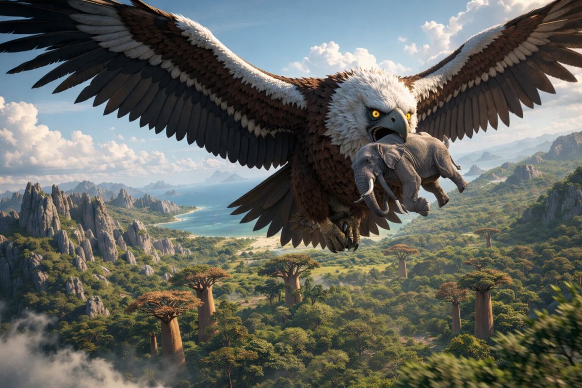 The Rukh is a colossal bird of prey said to live in distant lands, often associated with Madagascar or remote mountains. Its exact appearance is not fixed, but it is always described as enormous, sometimes so large that its wings stretch for vast distances. It preys on the largest animals, including serpents, elephants, and rhinoceroses, and is strong enough to carry them through the air. It is also said to use stones to kill prey.