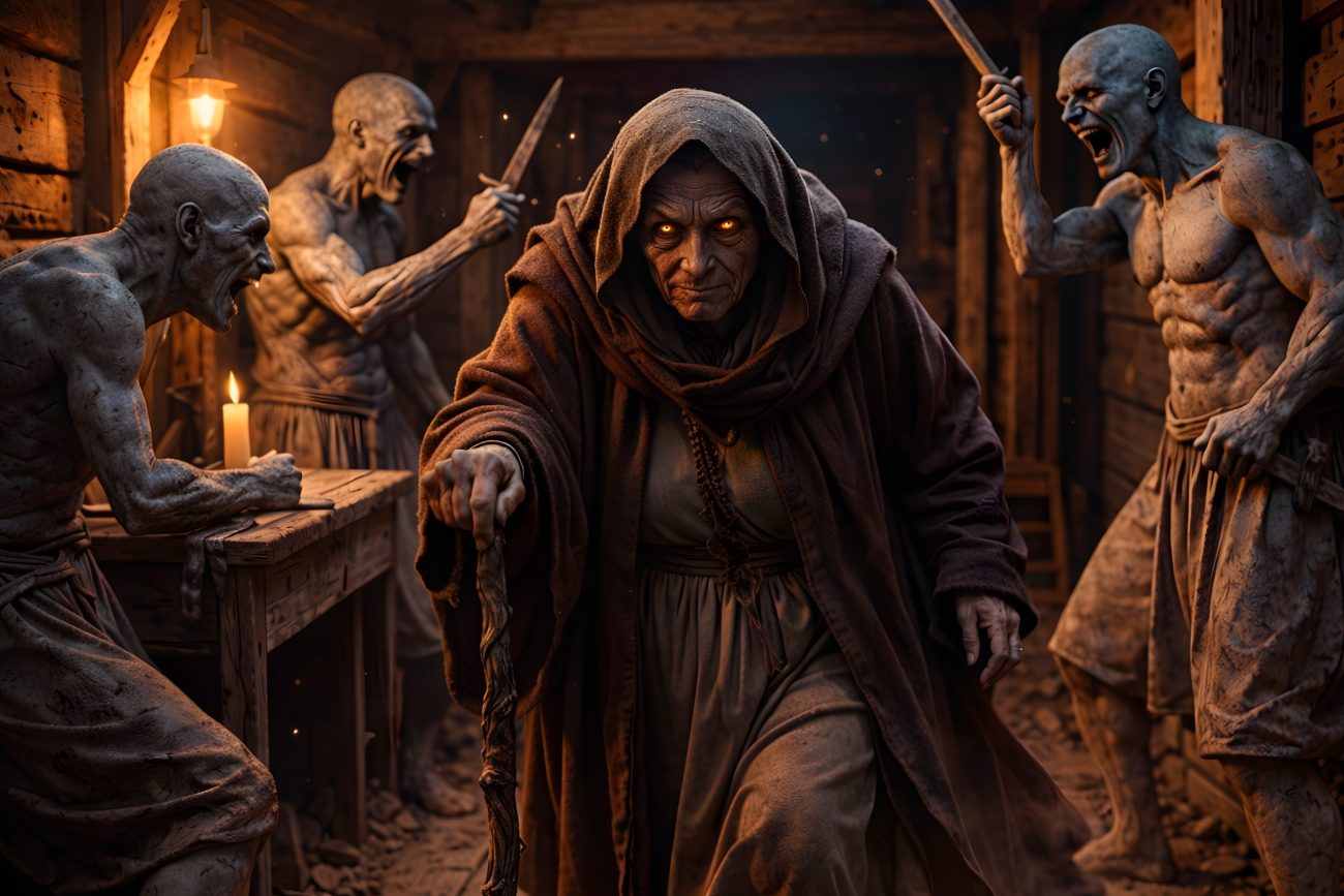 Faced with this atrocity, the godmother revealed her true nature. In her grief and fury, she used her powers to exact immediate justice, transforming the three soldiers into stone.