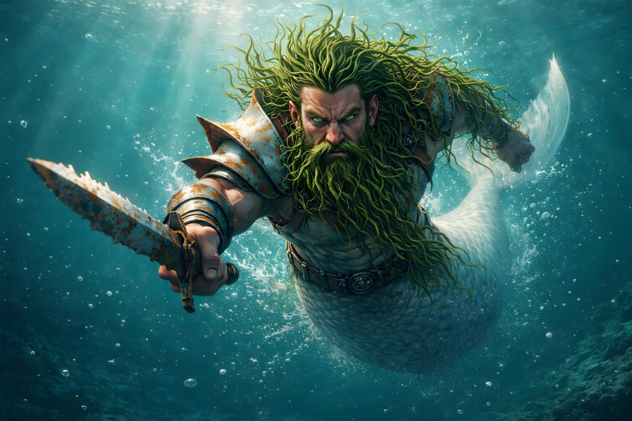 He appeared clad in armor, wearing a helmet as though he had come from battle beneath the waves. At first glance he seemed handsome, with a great moustache and thick flowing hair. But when the fishermen looked closer, they saw that both hair and moustache were made not of human strands, but of seaweed, tangled and dripping with saltwater.