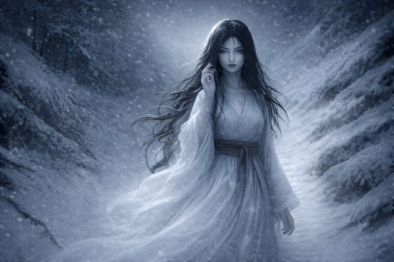 It comes quietly to lonely mountain huts where woodcutters, hunters, or fishermen are spending the night. The fire burns low, the wind moves through the trees, and suddenly the creature appears at the doorway or just beyond the light of the hearth.