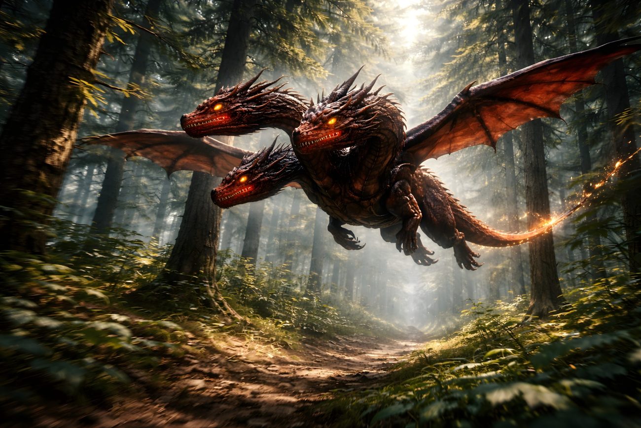 In the story, as Lāčplēsis follows Spīdola and enters the dark supernatural setting, dragons with tails are seen moving through the night. These dragons carry money and belongings while flying, and fiery sparks come from them as they move. They appear together with witches and other supernatural beings in the same environment.