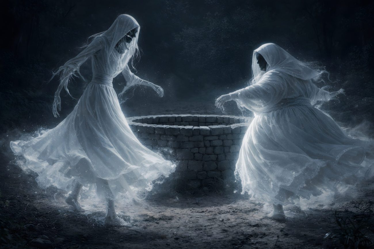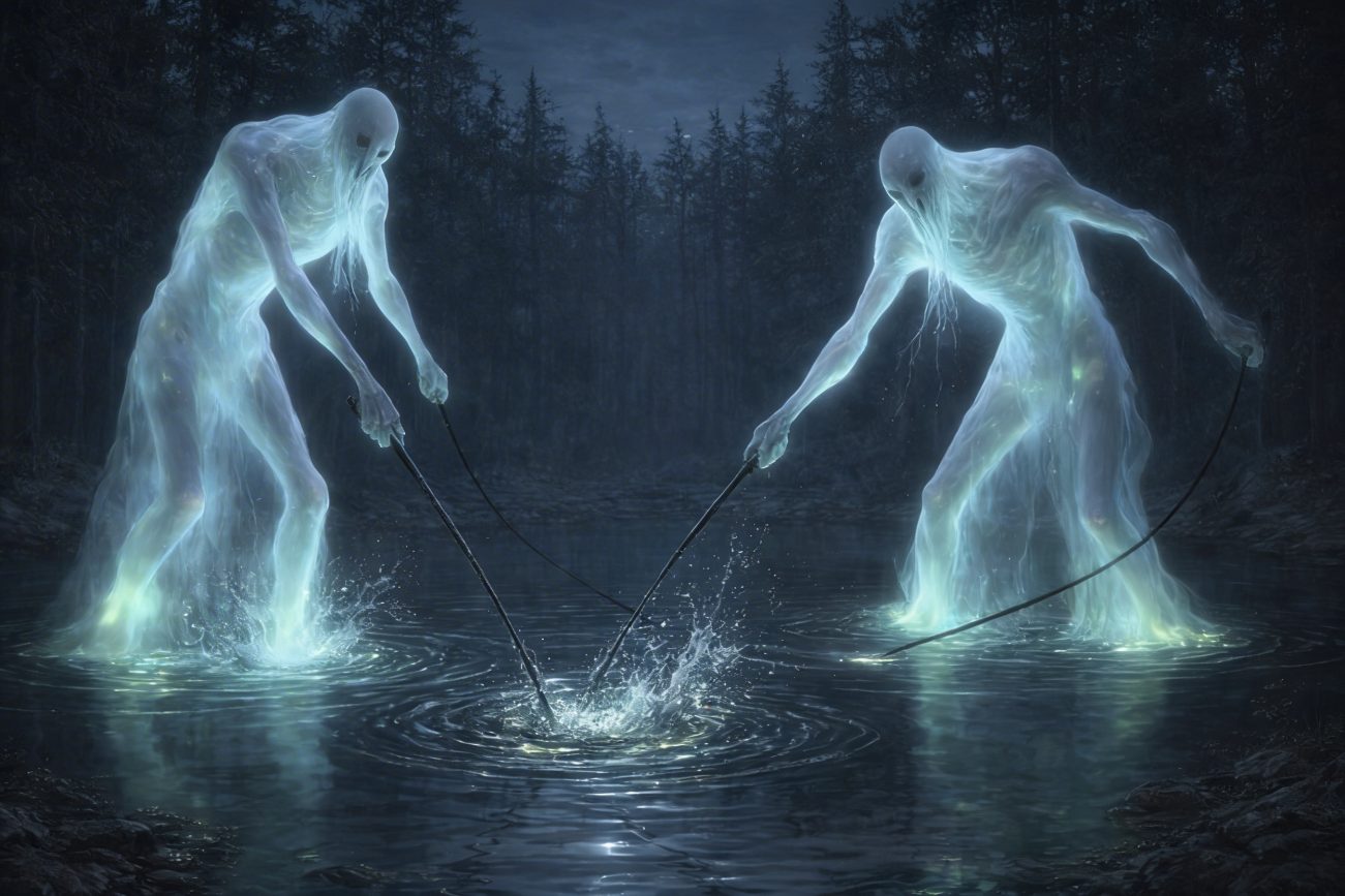 One night, several daring young men from the village hid behind thick tree trunks, each armed with a club, determined to uncover the truth. As midnight drew near, they again heard the whipping and the eerie cries, and they saw the figures dancing. At a signal, they rushed forward and struck with all their strength. But their blows met nothing. They heard only a splash in the pond, and then all was still.