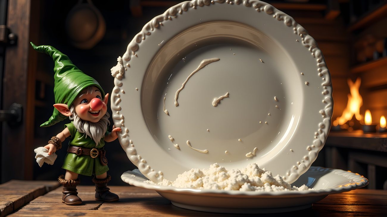 Each evening, after supper, the people living in the house would place their leftover food on the kitchen cupboard. As they did so, they would say, “This is for the little gnomes,” and then they would go to bed without clearing the table or washing the dishes.