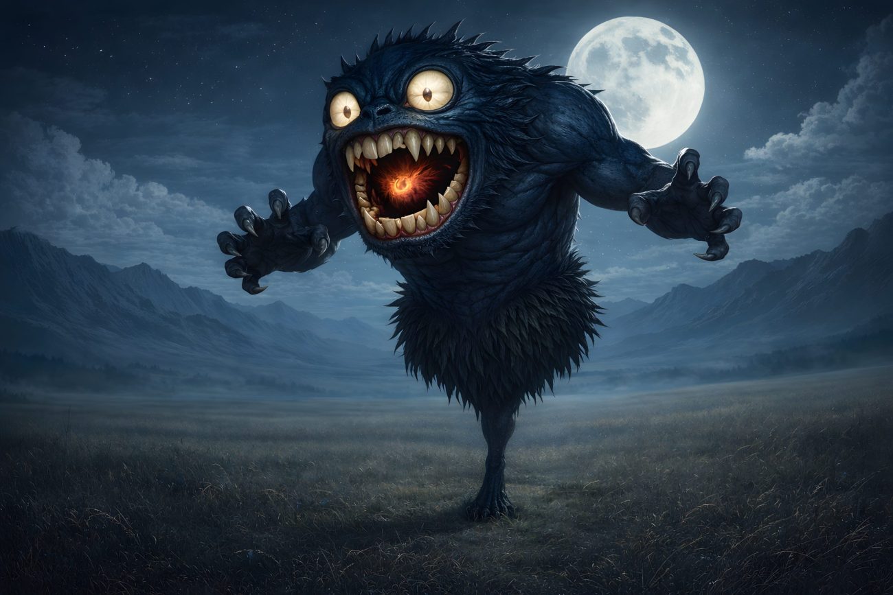 Though small in stature, it walks upright like a man. Its skin is black as soot, its beard long and tangled, its hair grey and unkempt. From its body sprout three arms—yet each ends bluntly, without hands or fingers. Upon its head sits a short, stunted horn, and in its face gleam three terrible eyes: one yellow, one red, and one blue. When it opens its mouth, five rows of teeth are revealed, layered deep within like the jaws of some monstrous trap.