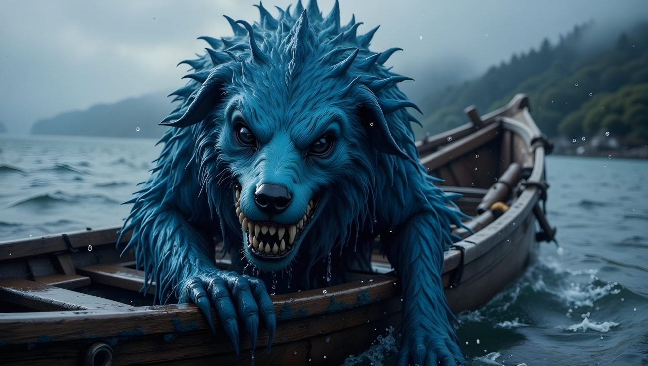 In the Kumano region, a related belief speaks of a blue sea dog, said to be the spirit of a drowned child that wanders the ocean. It moves unseen beneath the waves and may approach boats in silence.
