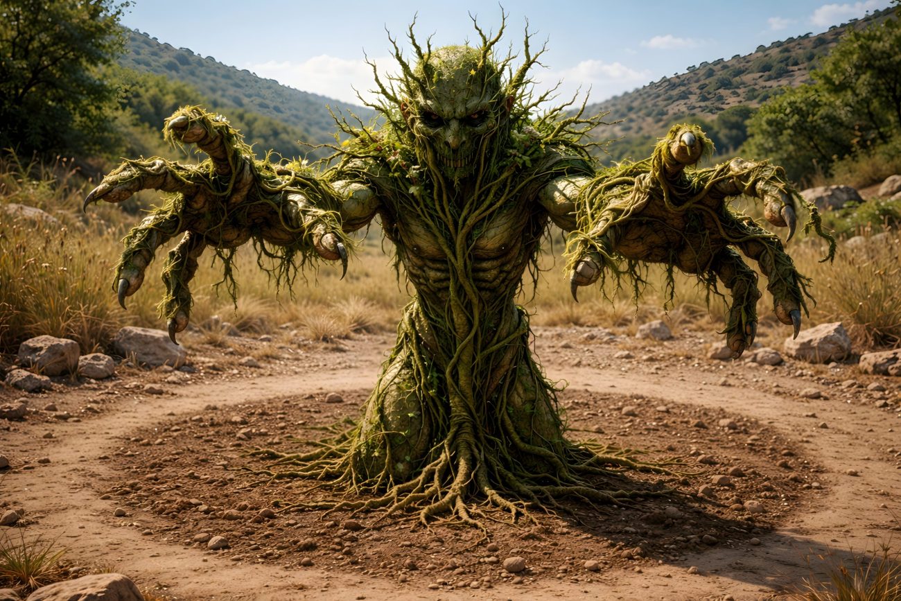 The deity was imagined with a human face bearing a foreign beard, while its body was formed from roots. Bundles of carrot-like tendrils served as its arms and legs, giving it the appearance of a spirit grown directly from the soil.