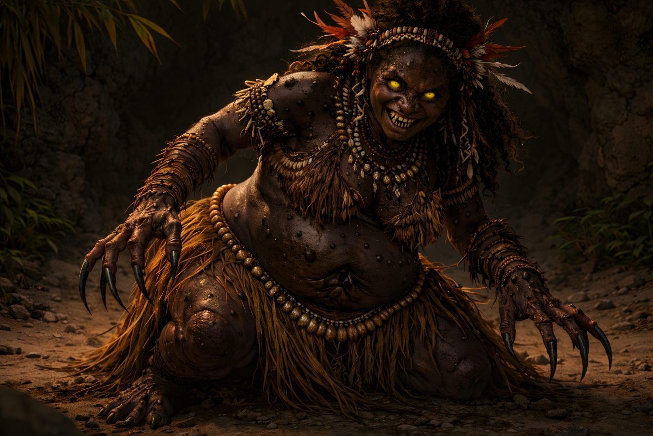 One morning, the man pretended to leave for work but instead hid himself in the attic, peering down to spy on his wife. When he was certain she believed herself alone, the woman set a great pot on the fire and cooked an enormous amount of rice. She shaped the rice into ball after ball, far more than any one person could eat. Then she did something horrifying. Letting her hair fall loose, she opened a hidden opening at the top of her head and began stuffing the rice balls into it, one after another. At that moment, the man understood that his wife was no human being, but a monster in disguise.