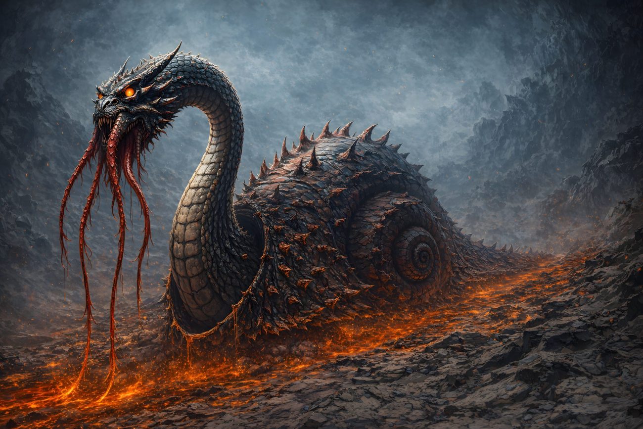 Lou Carcolh is a monstrous creature of Gascon folklore, whose name means “snail.” It is said to dwell in a deep cavern beneath the town of Hastingues in southwestern France. Half serpent and half mollusk, Lou Carcolh possesses a vast, elongated body crowned by an enormous shell as large as a house.