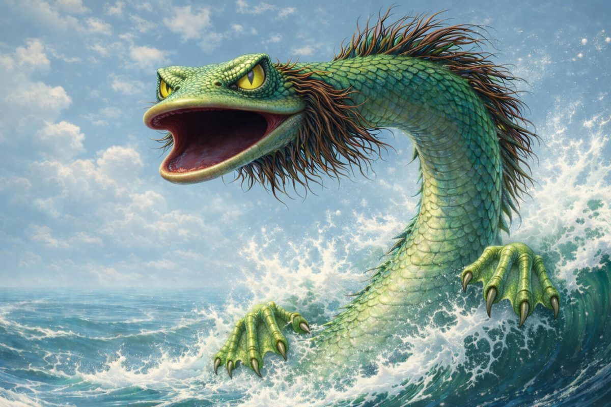 The Umibake emerges upon the surface of the water. Its body is long and slender like that of a serpent, stretching across the waves as it rises. Though its form is aquatic and elongated, its face and the shape of its hands resemble those of a familiar kind of yōkai often seen in monster scrolls, giving it an oddly human presence despite its inhuman body.