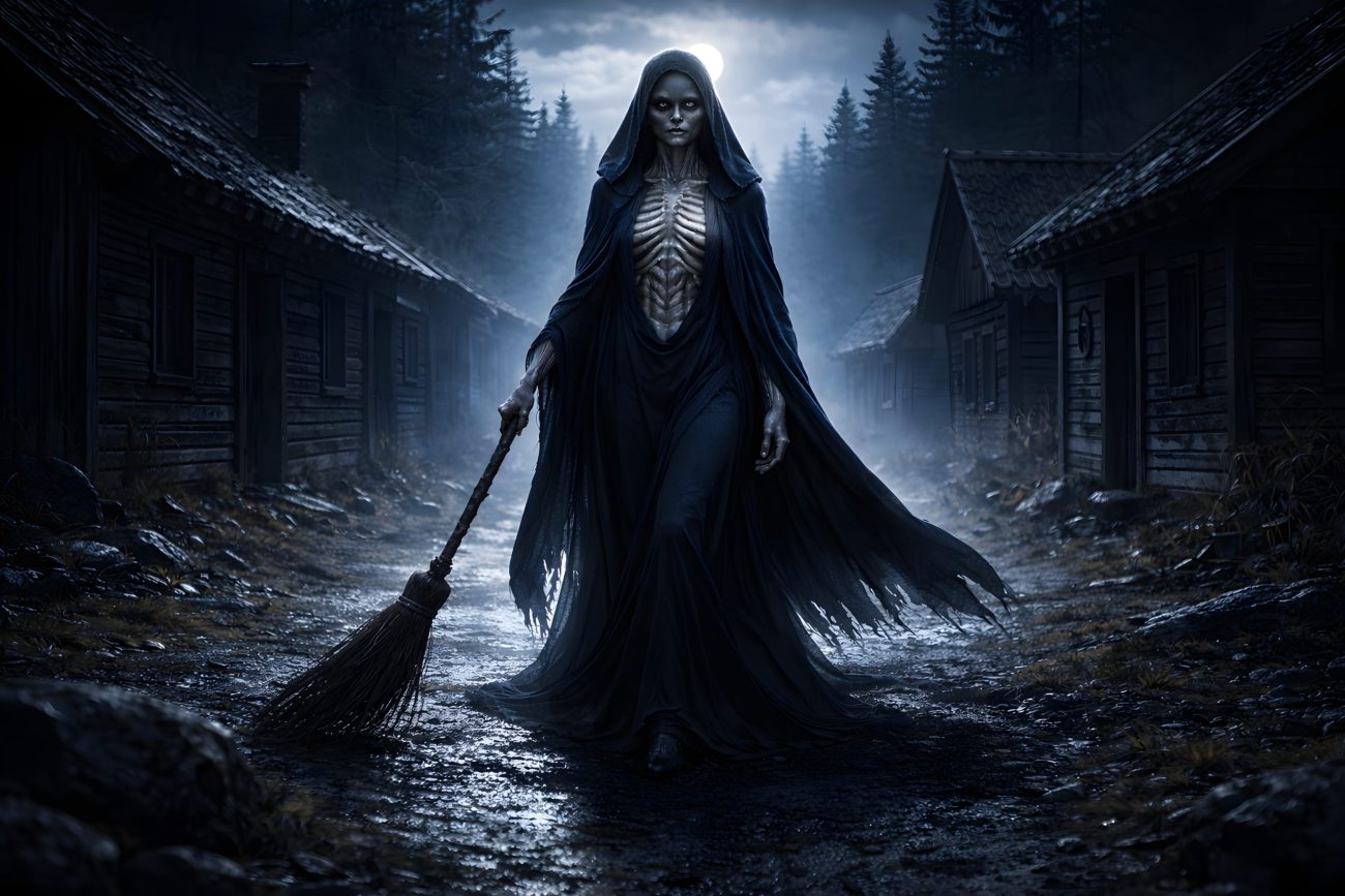It is said that she carries either a rake or a broom. If she arrives holding a rake, some people will survive the plague. If she comes with a broom, all will die, as she “sweeps” the entire population away.