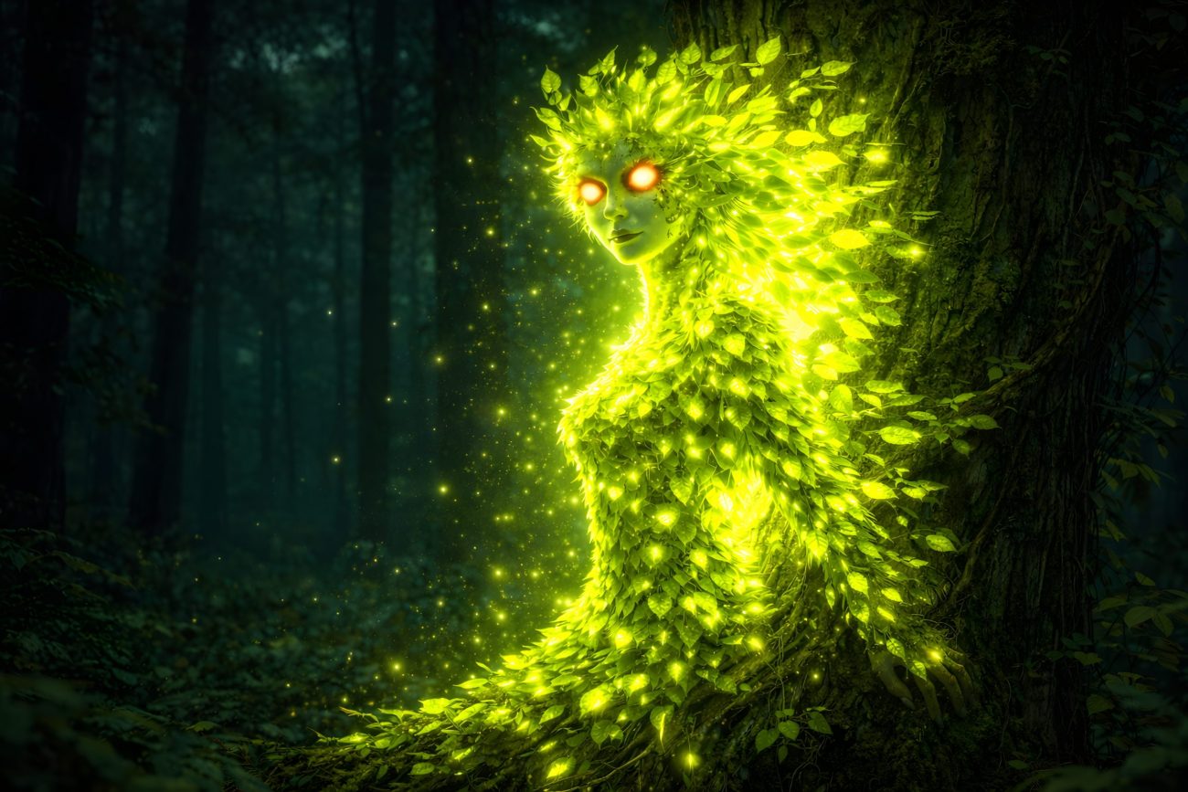 In other stories, the spirit appears in human form, often as an old woman or witch. She may be seen connected to the tree itself—sometimes bleeding when the tree is cut, or appearing wounded in the same place. This reflects the belief that the tree and the spirit are one and the same.